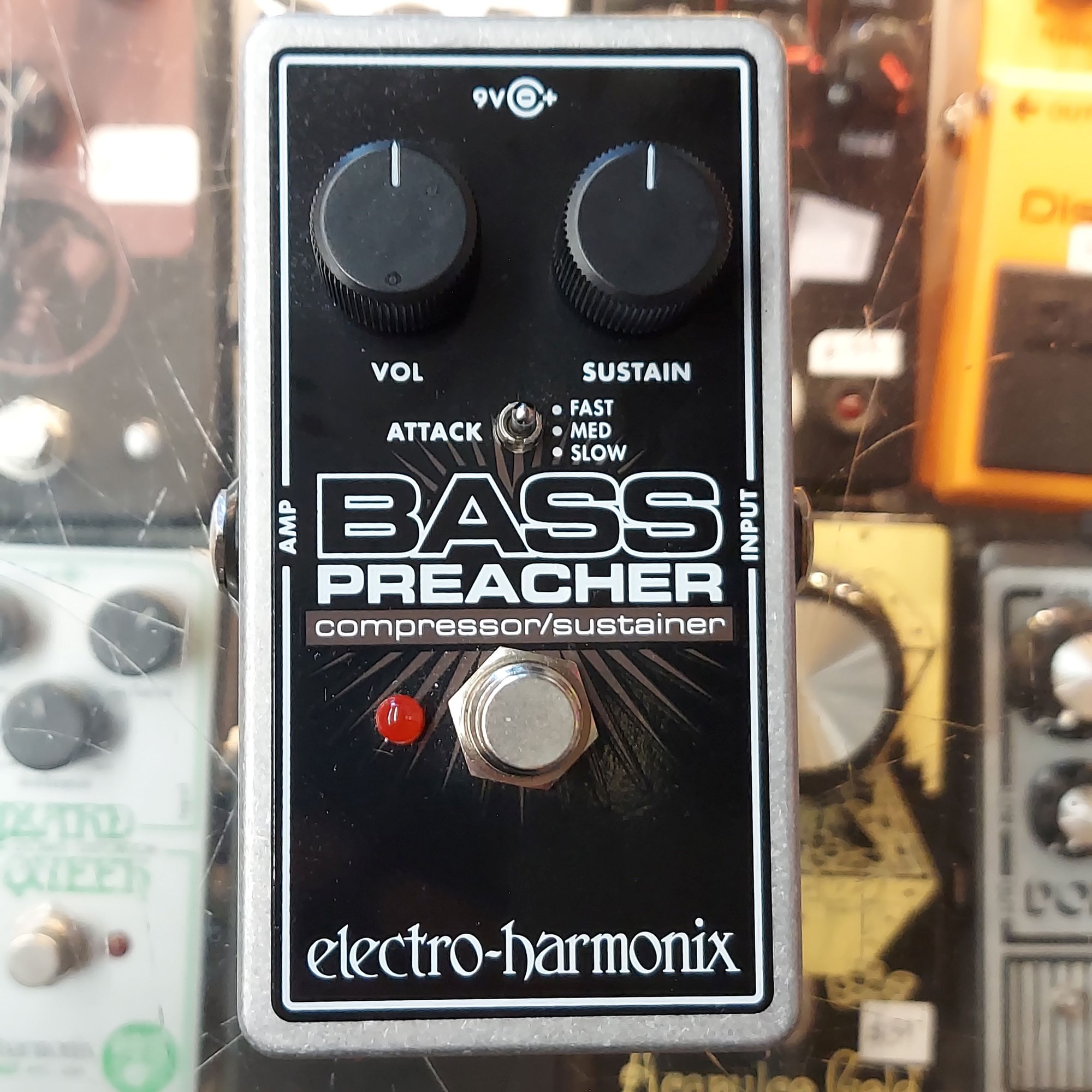 from the EHX website: "Bass guitars possess a huge dynamic range and produce powerful low frequencies. Designed for and by bassists, The EHX Bass Preacher compressor/sustainer features fully adjustable controls that can subtly transform the dynamic qualities of a bass guitar or take them to the extreme. From transparently leveling out notes so they sit in a track to creating an intensely squashed sound, the Bass Preacher helps spread the gospel of great bass tone!