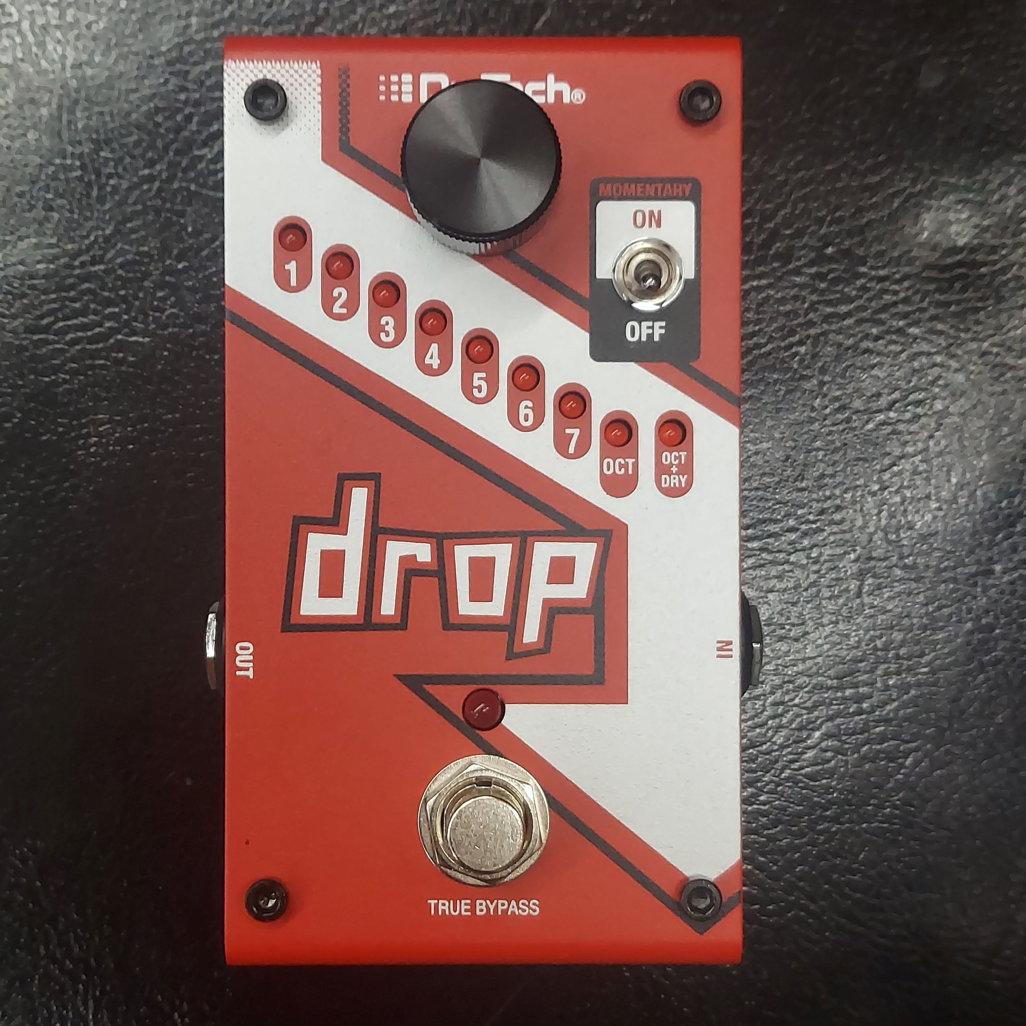 The DigiTech® Drop is a dedicated polyphonic drop tune pedal that allows you to drop your tuning from one semitone all the way down to a full octave. Get down-tuned chunk without having to change guitars! The Drop also features a momentary/latching switch. With the switch set to momentary, you can turn the Drop into a true performance pedal. Fast trills and roller-coaster pitch dips are at the tip of your toes."