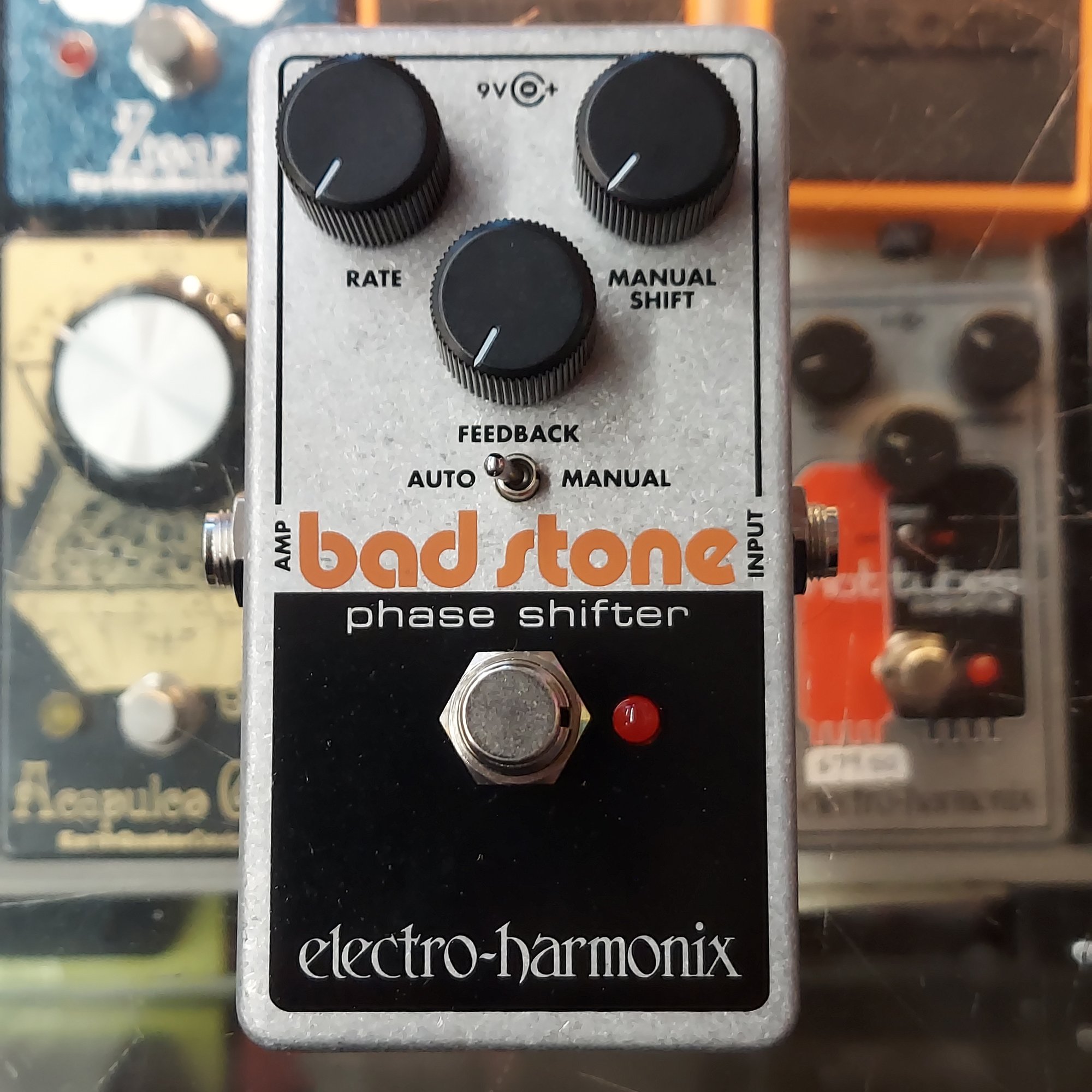 from the EHX website: "The legendary EHX Bad Stone Phase Shifter resurrected! With prices of 1970’s vintage Bad Stones soaring, now is your chance to get a reissue that is faithful to the original circuit design and three-knob control layout, but features up-to-date enhancements for the modern player. The Bad Stone delivers an incredible six stages of phase shifting plus a manual mode that lets the player freeze the phase. Its Rate knob controls the phase shifting speed which goes from a very slow swoosh to a rapid, oscillating warble. Feedback determines the depth of the phase effect and a toggle switch lets the user select Auto or Manual modes."