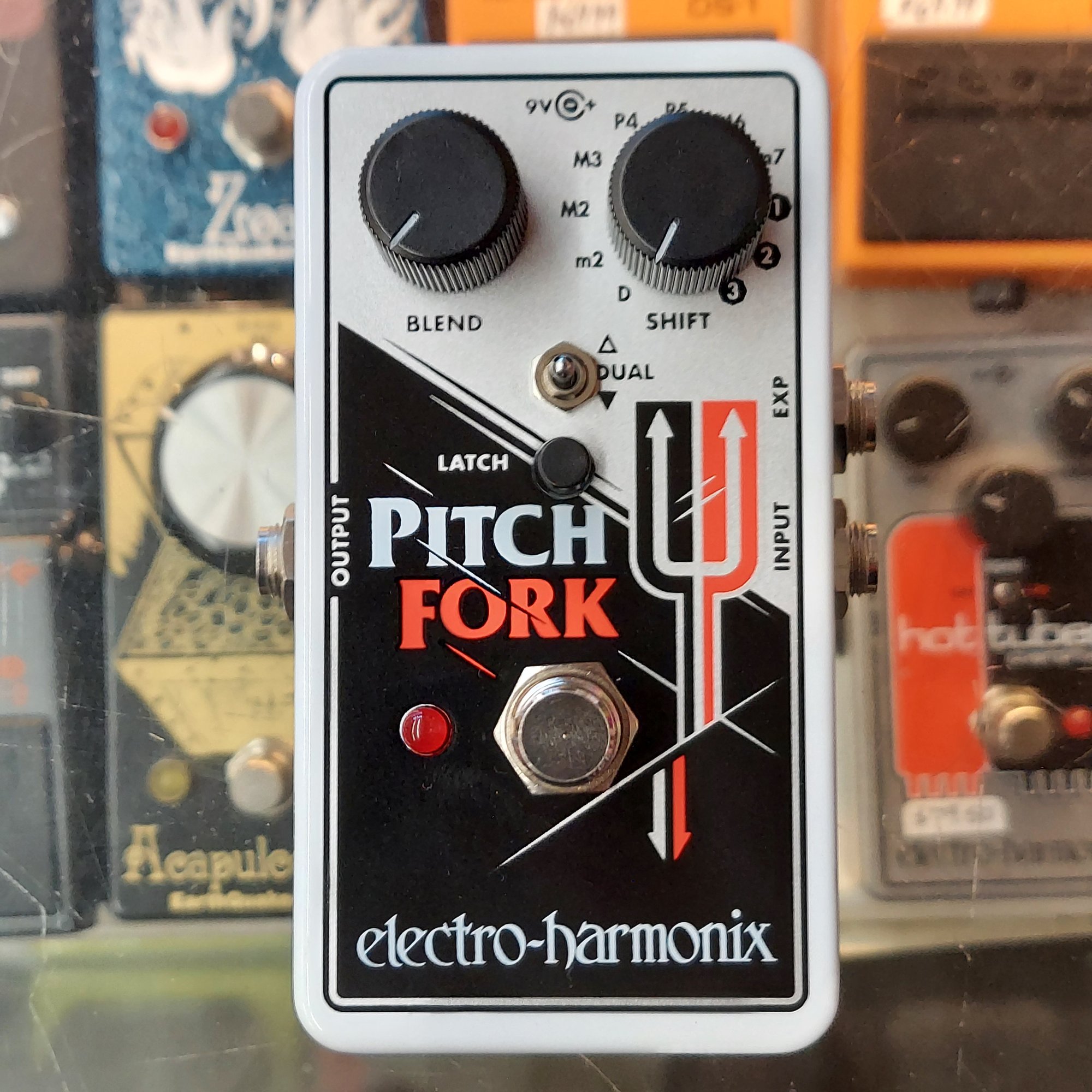 from the EHX website: "The EHX Pitch Fork transposes an instrument’s pitch over a +/- three octave range and features three modes which allow the pitch to be transposed up, down or both, simultaneously. The pitch shift amount can be set to a fixed interval or continuously varied by an expression pedal or control voltage.