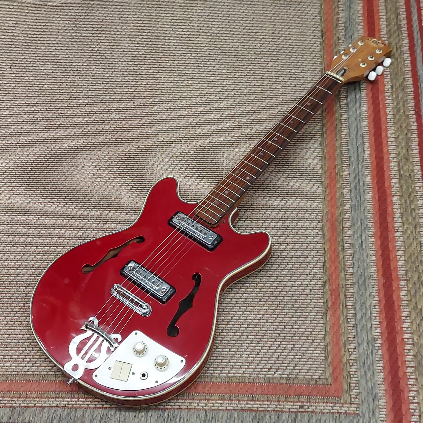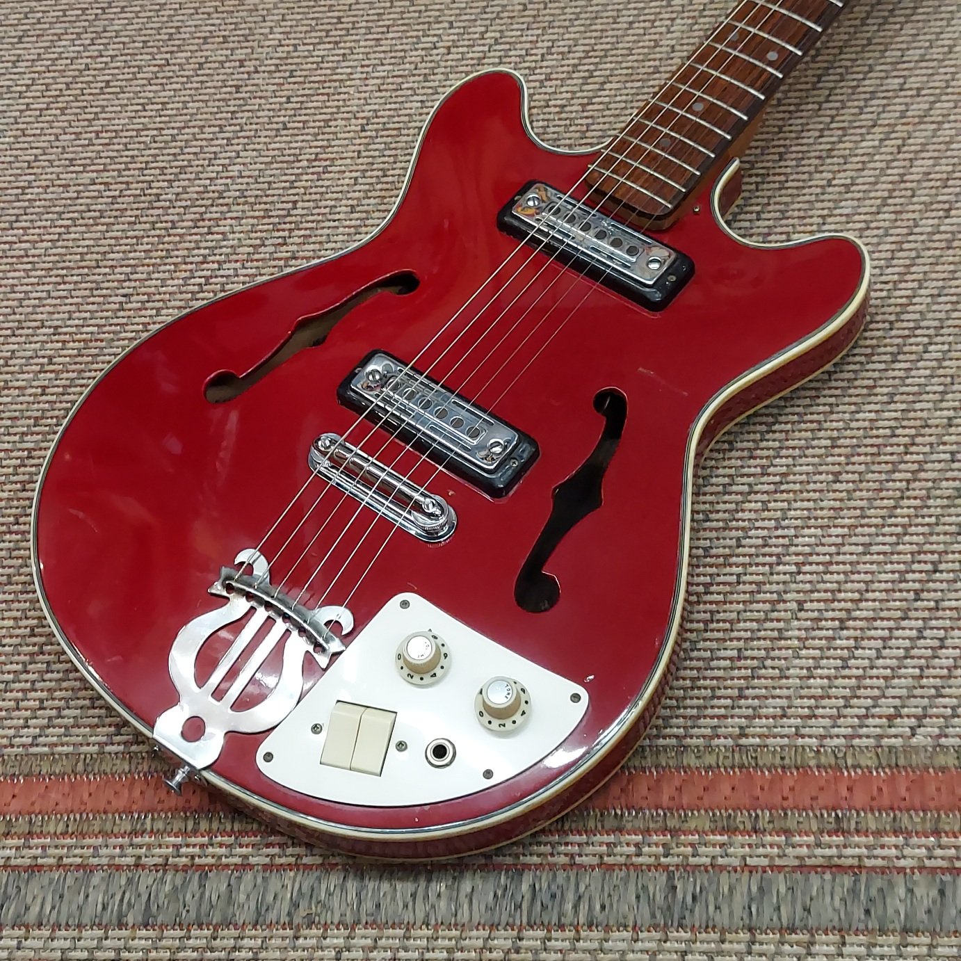 Super fun and amazingly lightweight. It's a 60s Vintage Teisco EP-7 Hollowbody Electric. Gibson (24.5") scale length yet deceptively small feeling while having a nice full voice. Bought at the old shop 10+ years ago and played by one of our VIP customers who wishes to remain anonymous... let's just say she slays.